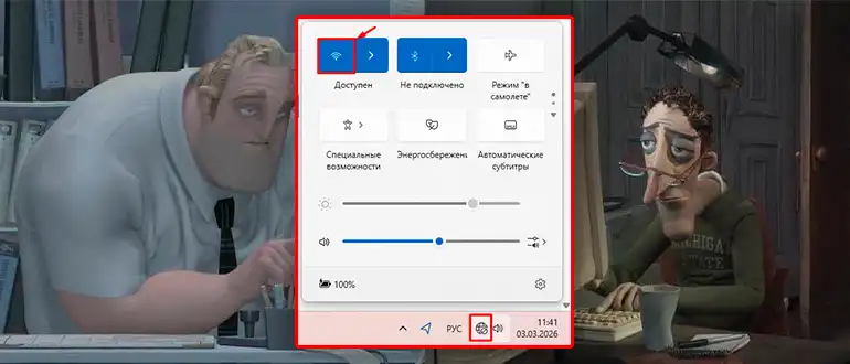 В Windows 11 эта панель называется «Быстрые настройки». Открывается она кликом по группе значков рядом с часами: сеть (может быть Wi-Fi, «планетка» или «кабель»), громкость и батарея. Если у вас подключен провод, то вместо значка Wi-Fi вы обычно видите «кабель» – это нормально, просто Wi-Fi может быть выключен или не нужен. А вот «планетка» чаще всего появляется, когда компьютер не подключен ни к одной сети.